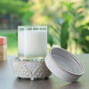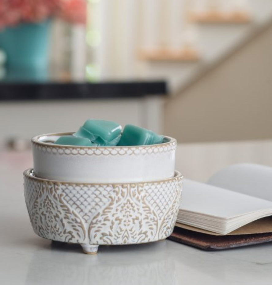 DESIGN: Patterned like flocked wallpaper in an antique white reactive glaze and soft scalloping combine to make the Vintage White 2-in-1 Fragrance Warmer.